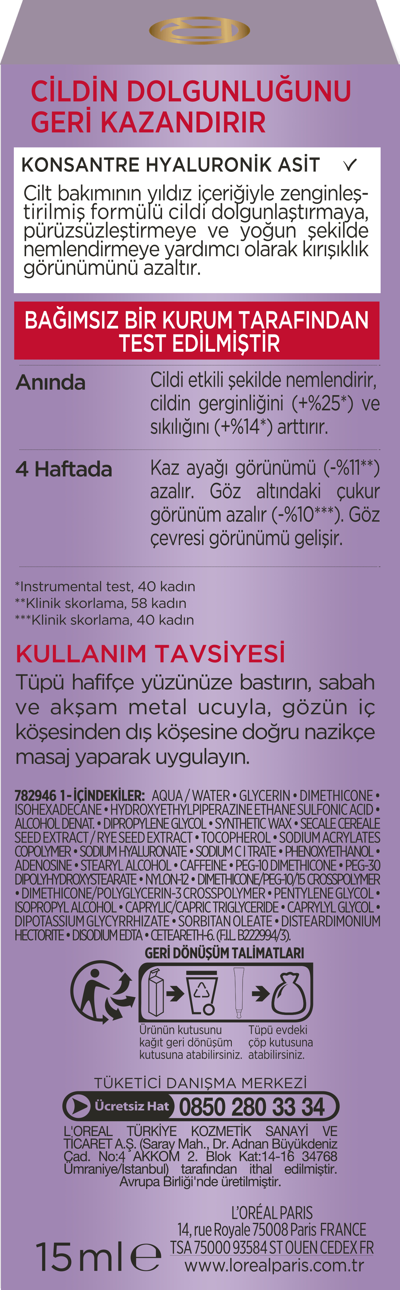 Göz çevresi bakımında devrim yaratan L'Oréal Paris Revitalift Filler Göz Kremi, özellikle hyaluronik asidin gücüyle öne çıkan formülü sayesinde, ciltteki yaşlanma belirtilerini azaltmayı hedefler. Bu ürün, göz çevresinde yaşanan kırışıklıkların görünümünü hafifletmek ve daha genç bir görünüm kazanmak amacıyla tasarlanmıştır.