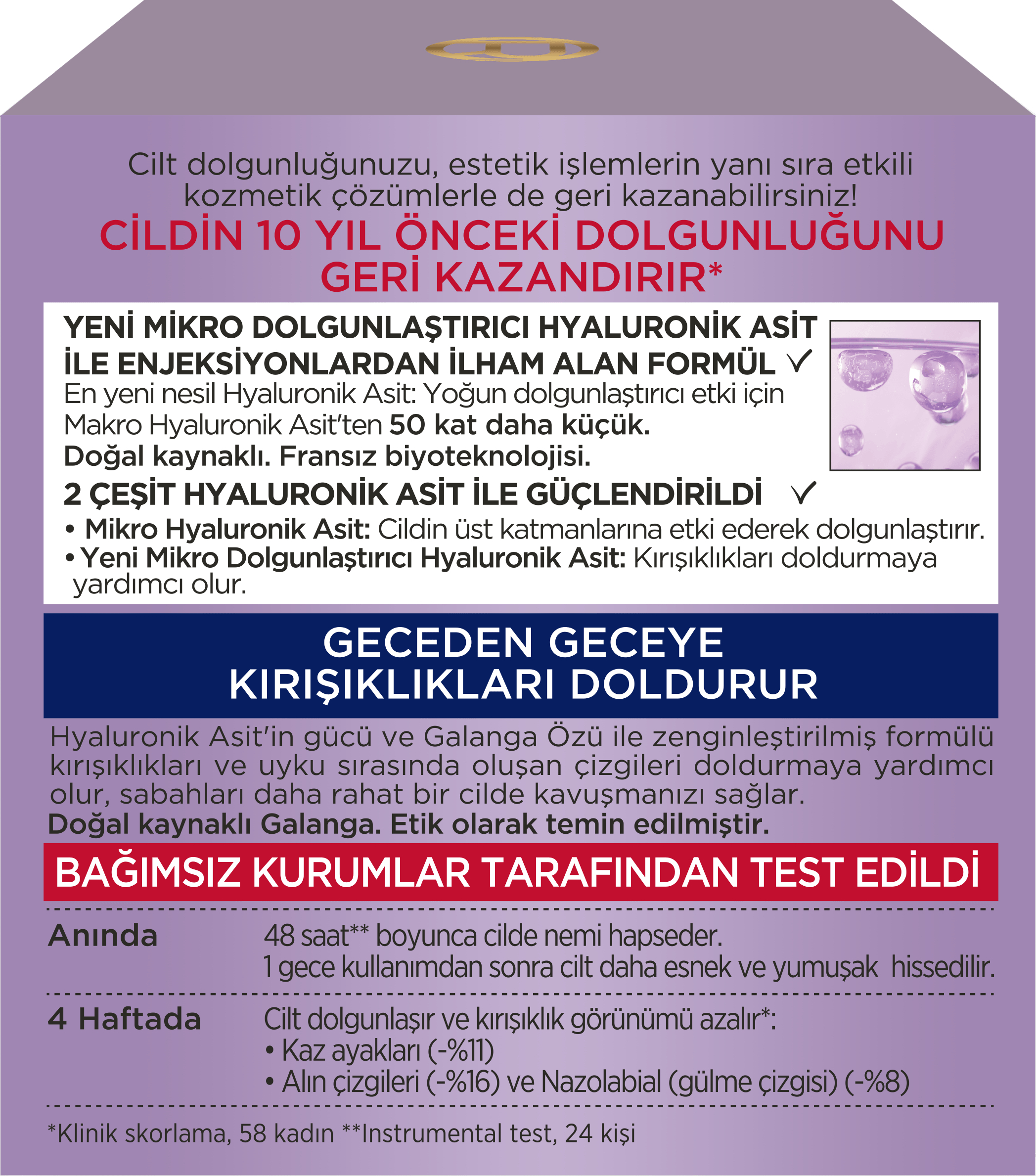 Formülünde bulunan mikro hyaluronik asit, cilde derinlemesine nüfuz ederek, 50 kat daha küçük yapısıyla, cildin en derin katmanlarına ulaşır. Bu sayede, ciltteki çizgilerin ve kırışıklıkların görünümünü azaltmaya yardımcı olur. Ayrıca, hyaluronik asidin nem tutma kapasitesi sayesinde, cilt 48 saat boyunca nemli ve dolgun kalır. Galanga özü ile zenginleştirilen formül, cildin yenilenmesine katkıda bulunur ve gece boyunca oluşan çizgilerin doldurulmasını sağlar.